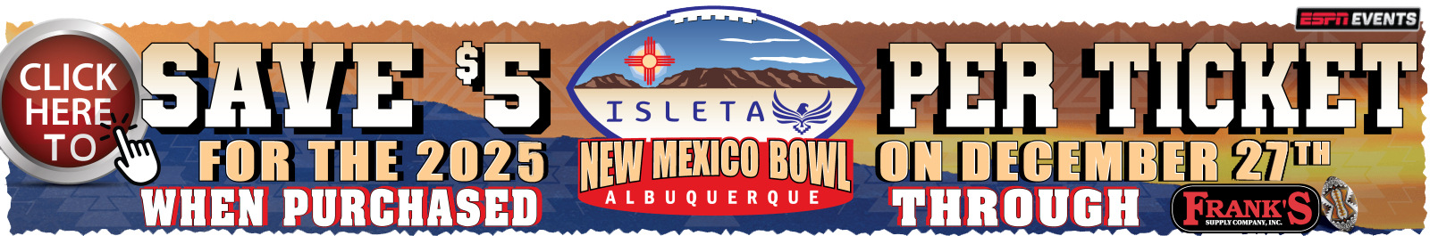The 2026 Isleta New Mexico Bowl will be held in December 2026. Tickets will go on sale to the general public in December. In the meantime, secure exclusive first access to the best seats by signing up for our pre-sale: